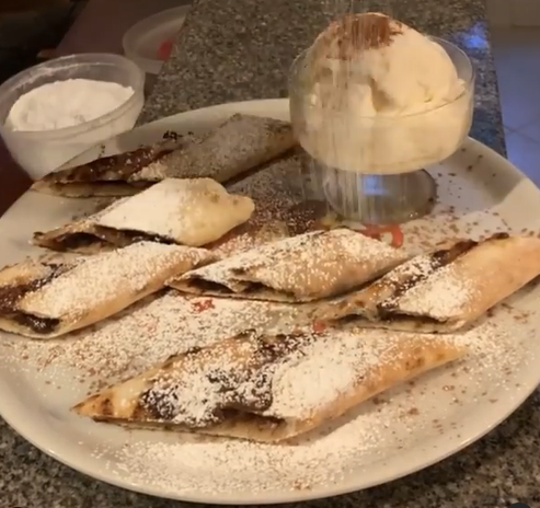 "(rollos rellenos de nutella acompañados con helado de vainilla)"