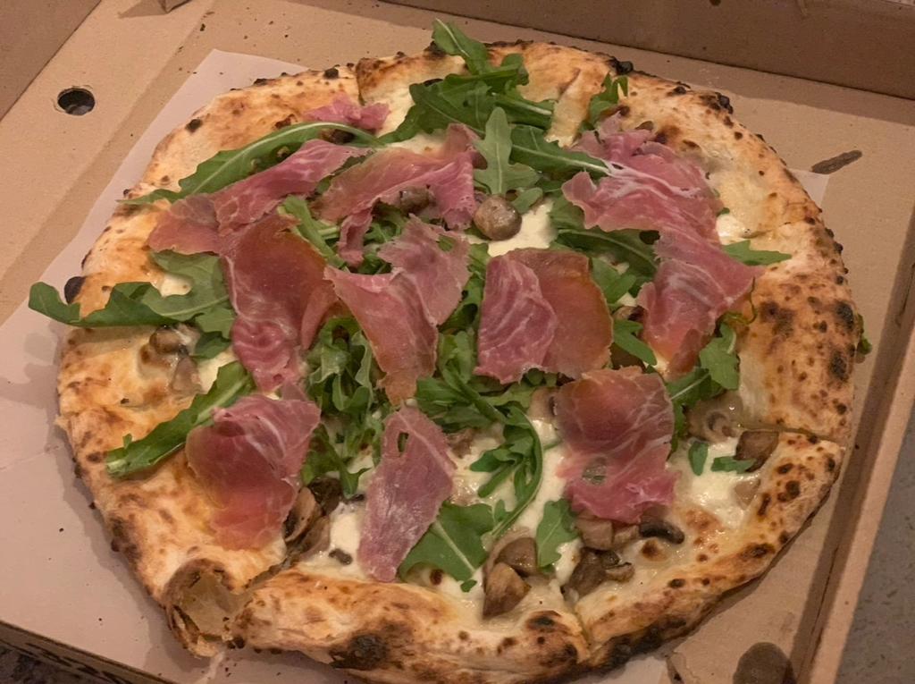 "(mozzarella, queso azul, champiñones, rugula, Jamón serrano ) (mozzarella, blue cheese, mushrooms, arugula, serrano ham)"