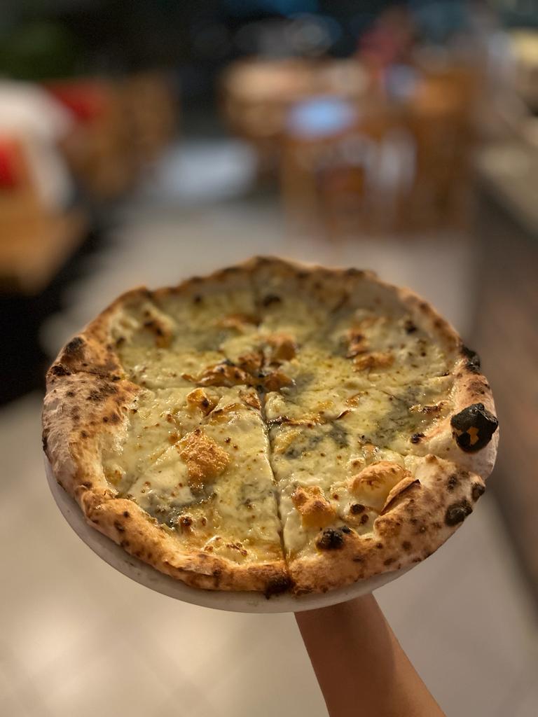 "(queso azul, mozzarella, provola, parmesano) (blue cheese, mozzarella, provola, parmesan)"