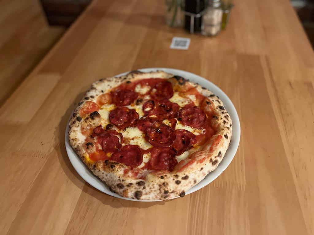 "(Salsa de tomate, mozzarella, salame picante, pimienta roja) (Tomato sauce, mozzarella, spicy salami, Red pepper)"