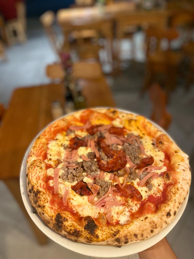 "(base pesto, mozzarella, jamón, stracciatella) (pesto base, mozzarella, ham, stracciatella)"