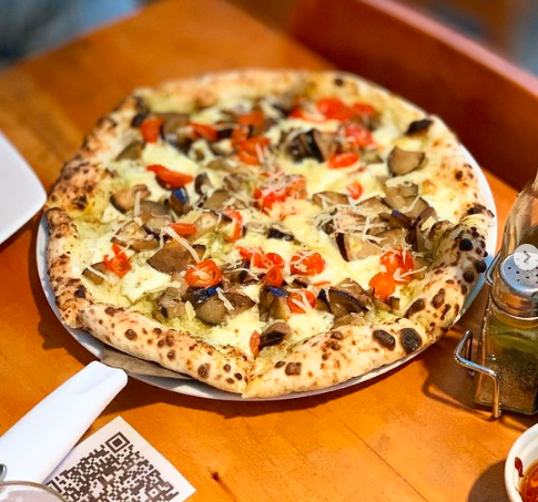 "(mozzarella, queso azul, rugula, champiñones,jamón serrano) (mozzarella, blue cheese, arugula, mushrooms, serrano ham)"