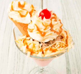 Copa crispy blanco, chocolate, acompañado de queso, crema chantilly, barquillos, 2 sabores de helado y salsa a elegir.