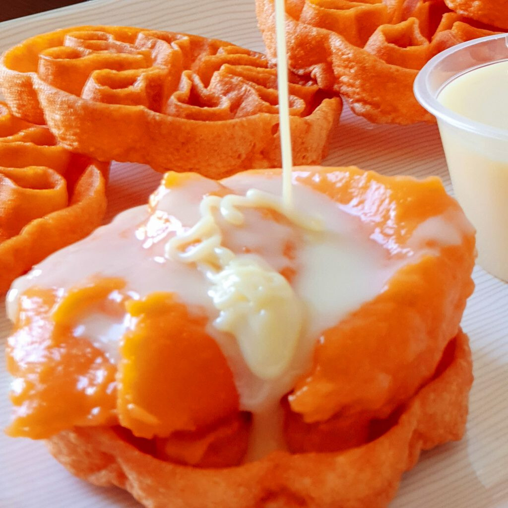 Oblea triturada acompañada de crema y salsa de Arequipe.