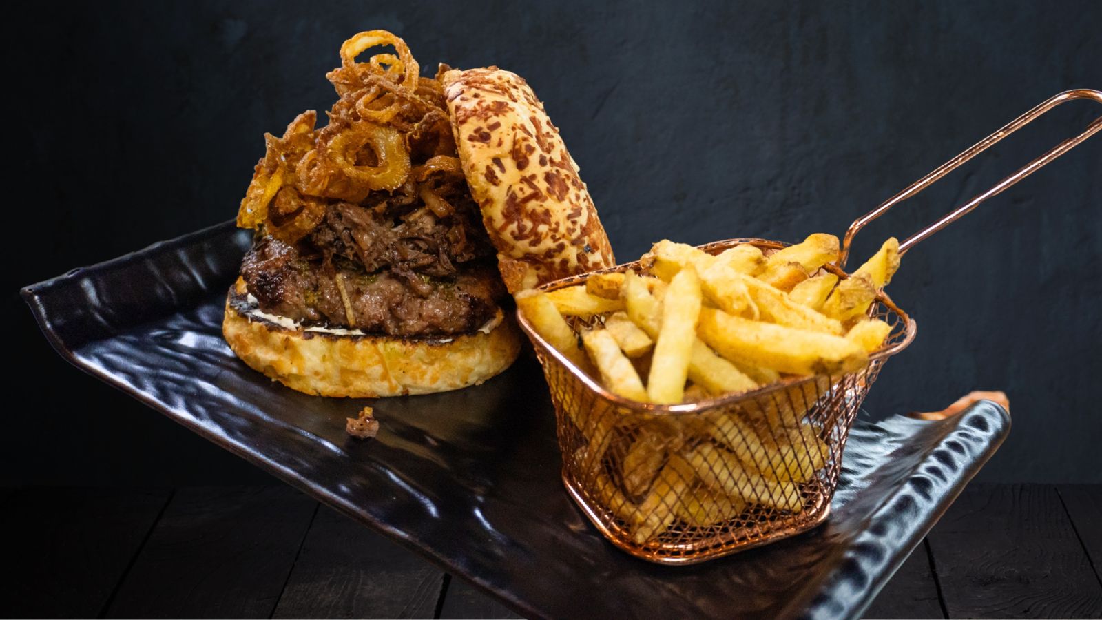 Pan pretzel, carne artesanal, carne desmechada bañada en BBQ, queso crema, lechuga roble rojo, cebolla crispy, papas a la francesa