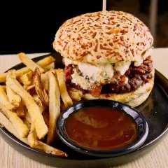 Hamburguesa dulce pagado con pan brioche 90gr, carne artesanal 190gr, tocineta ahumada de 80gr bañada en BBQ jager, queso crema, salsa de la casa, acompañada de papas a la francesas