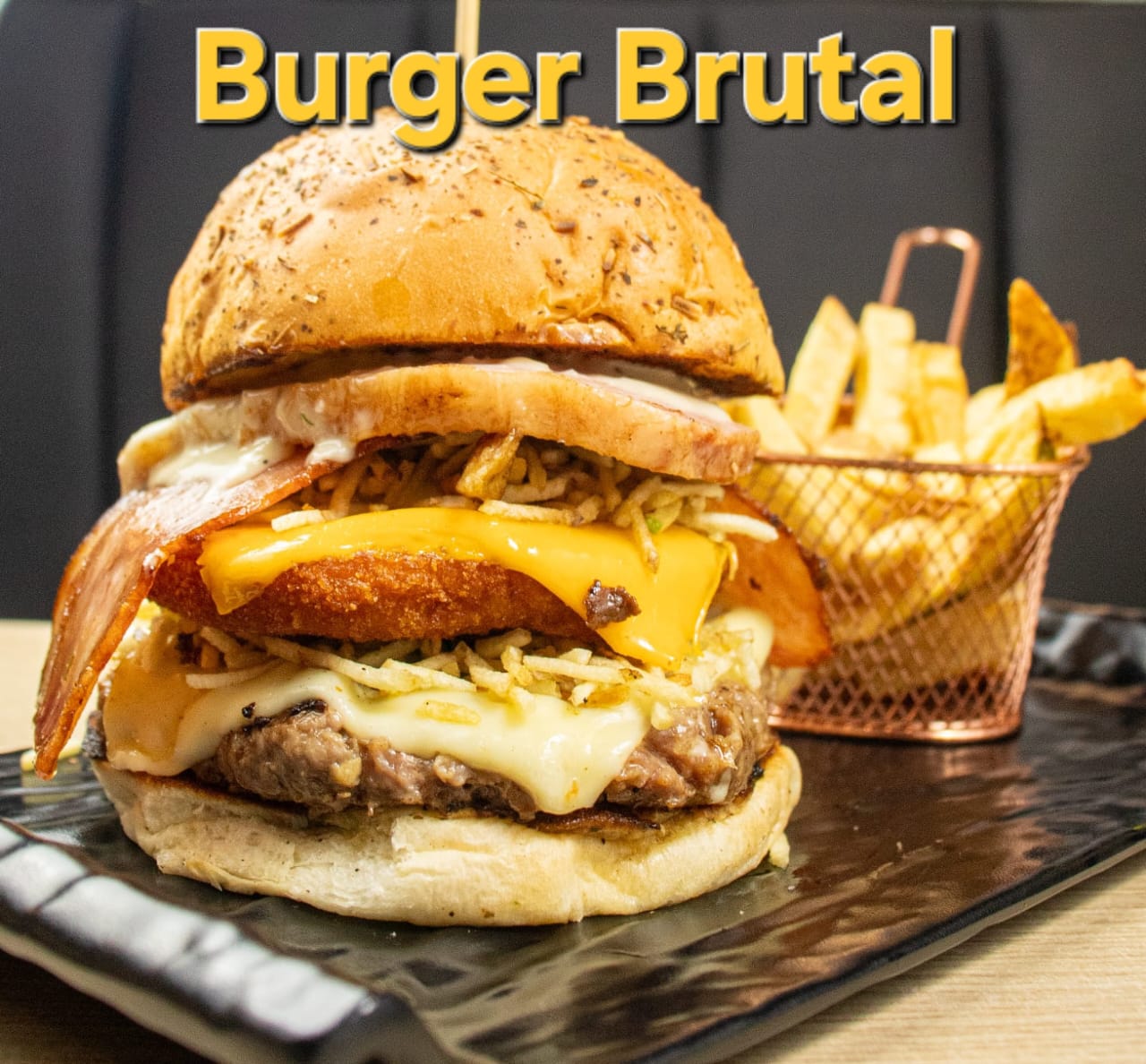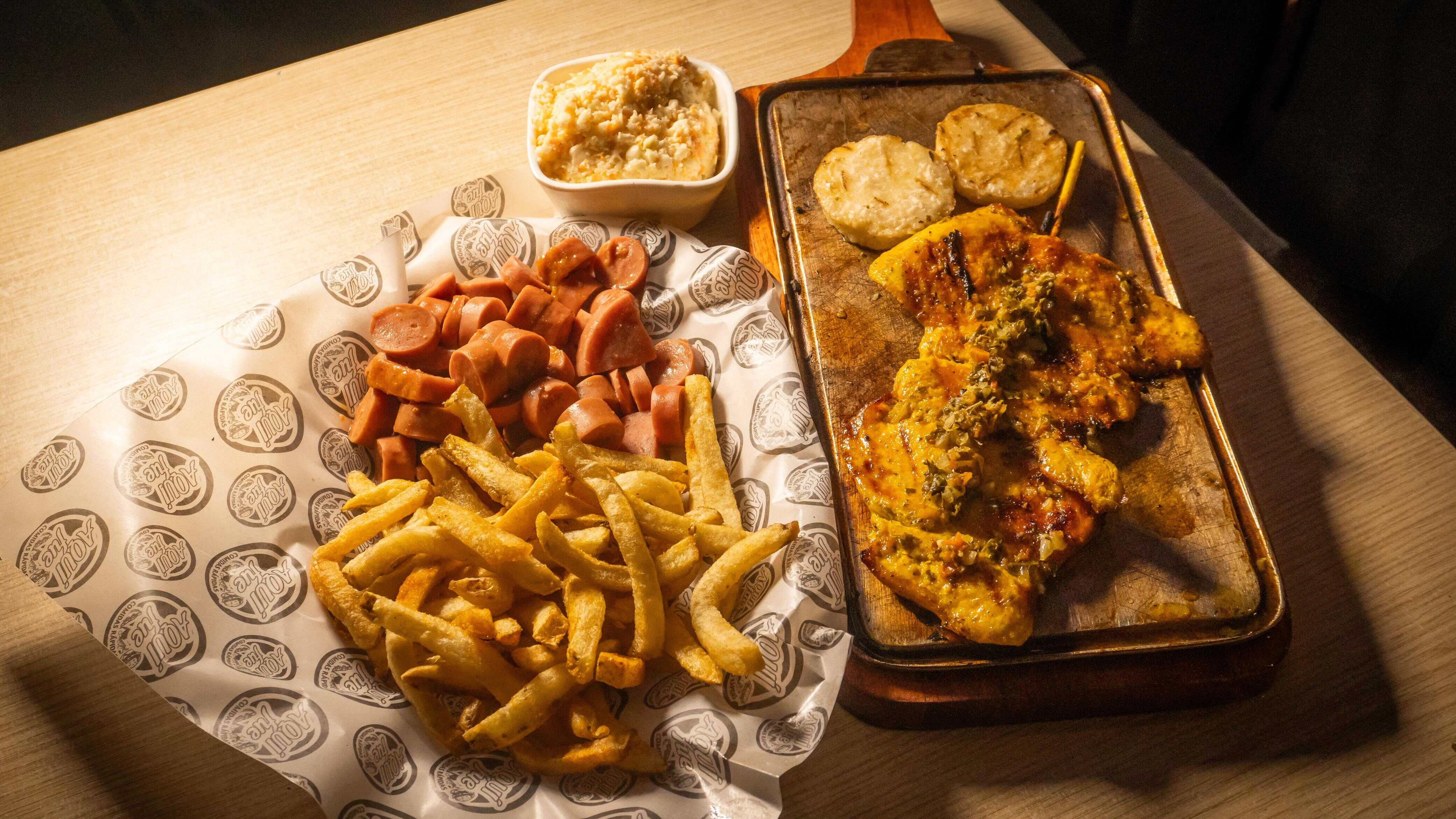 Carne artesanal, pollo, chuleta humada, queso mozzarella, tocineta ahumada, lechuga, tomate, ripio, salsa de la casa y papas francesa.