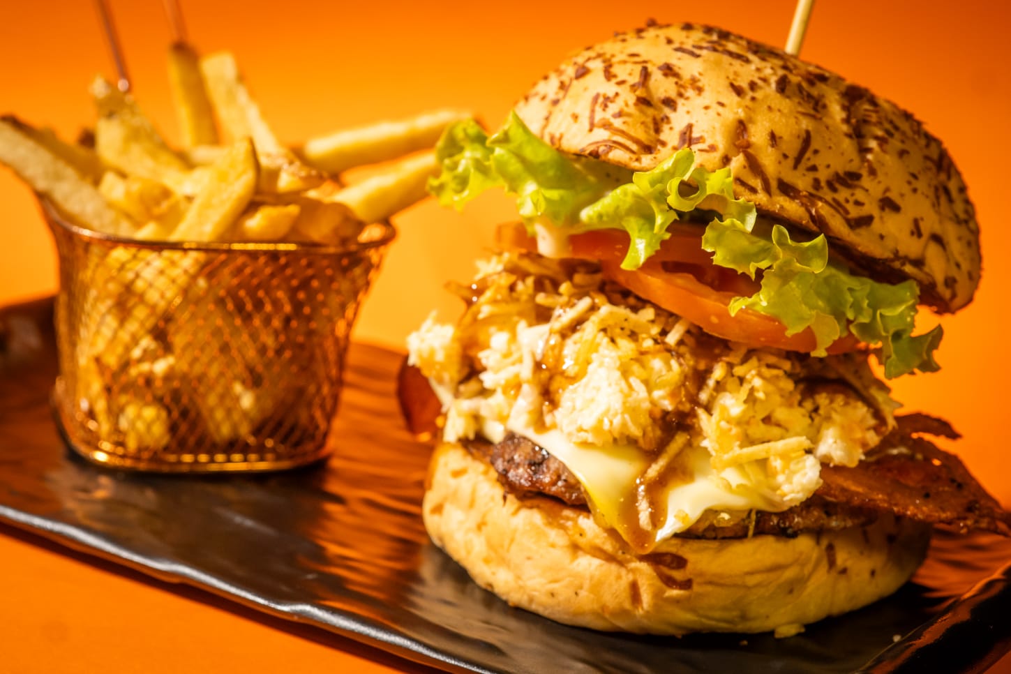Pan pretzel, carne artesanal, queso costeño asado, guacamole, chicharron ahumado, lechuga roble rojo, papas francesas