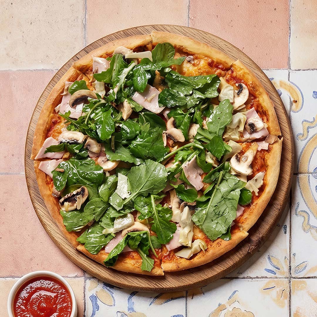 Cortes de pollo con champiñones salteados en finas hierbas, salsa napolitana, queso mozzarella y parmesano.