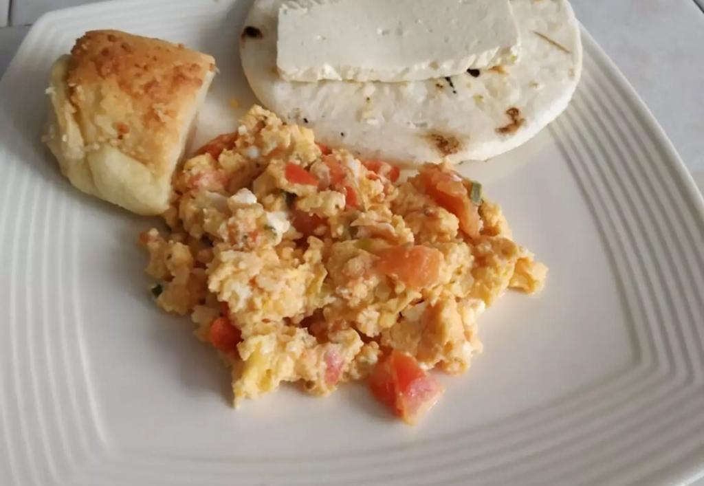 Arepa con quesito, 2 huevo revueltos, pan y 8 onzas de chocolate negro, en leche o guarapo, calentado.