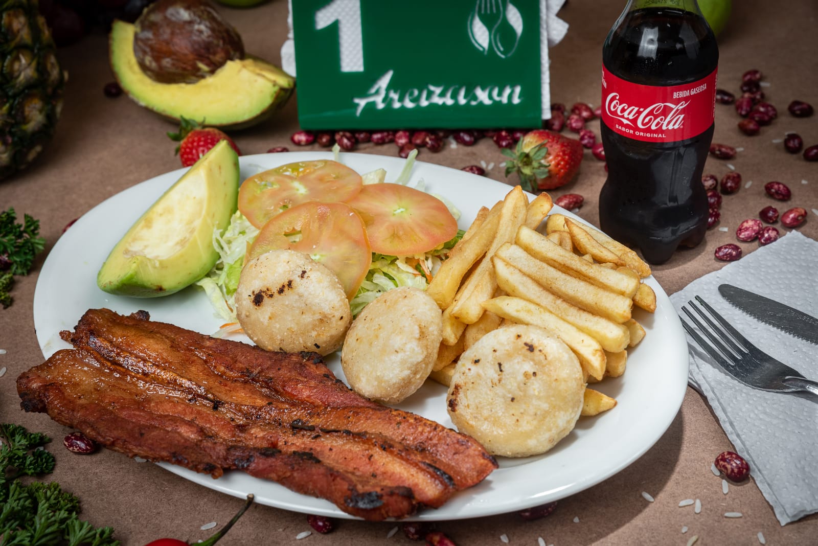 Porcion personal: Un plato lleno de sabor colombiano: arroz, fríjoles, ensalada fresca, arepa, maduro, 30 g de papas a la francesa y huevo, acompañado de 100 g (peso en crudo) de tu proteína favorita. Incluye sopa y bebida para disfrutar una comida completa. Los sudados no incluyen fríjoles.