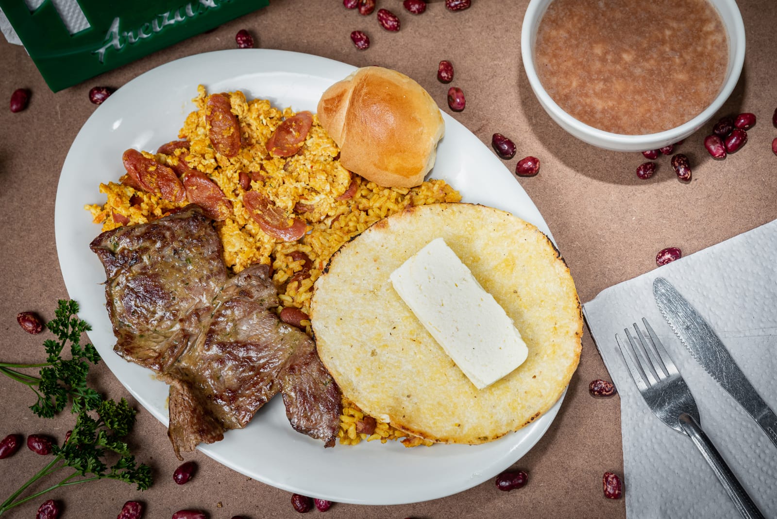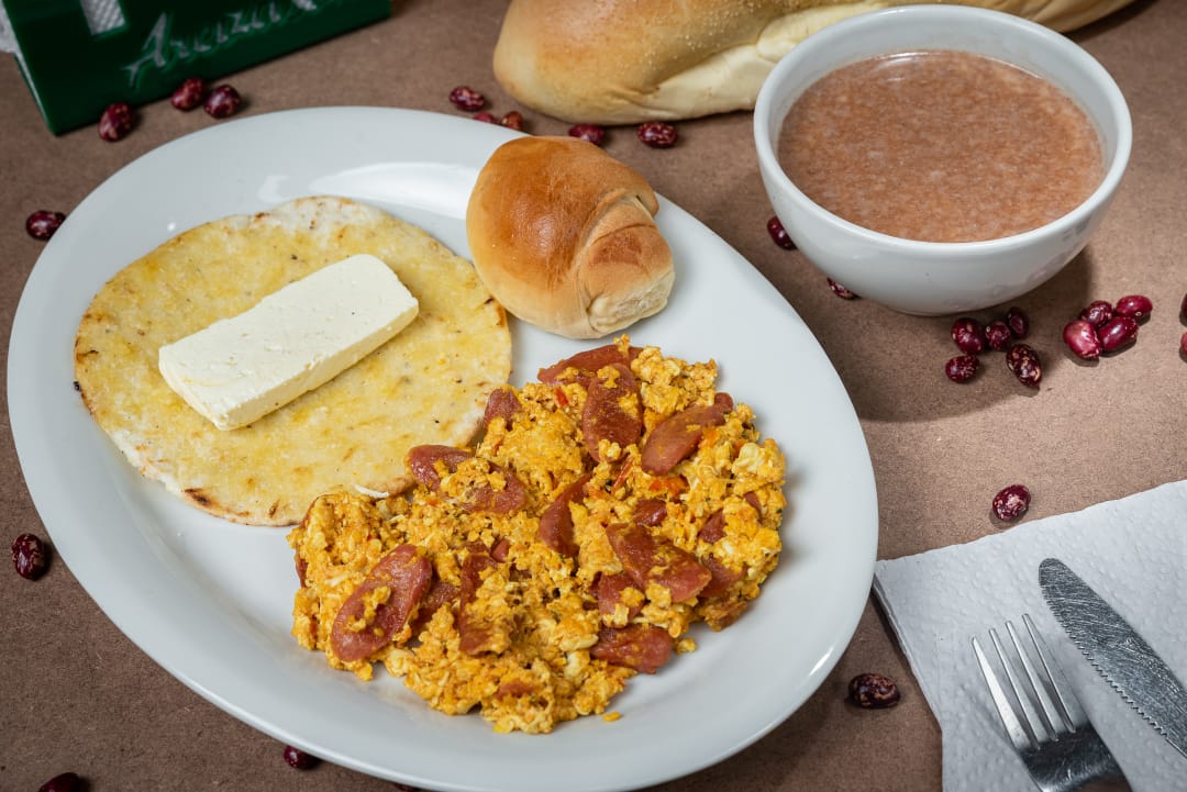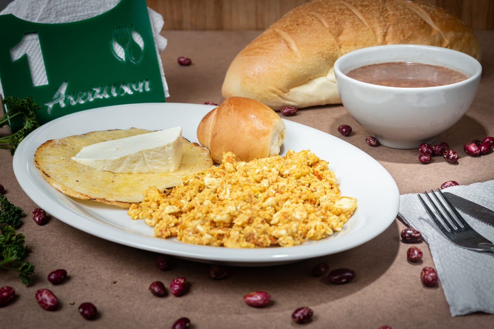 Una combinación llena de sabor: arepa con quesito, huevos rancheros (con o sin aliños), un calentado casero y 100 g de proteína a elección. Acompañado de pan fresco y una bebida para disfrutar al máximo tu mañana.