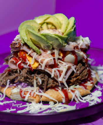 Patacón con salsas secretas, ensalada, carne mechada, jamón, bacon, queso frito y aguacate.