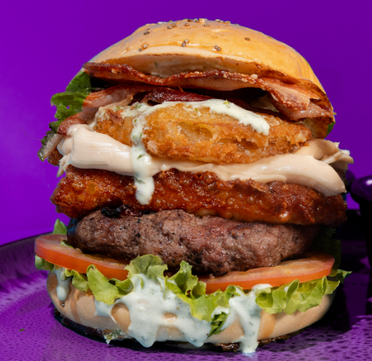 Carne de res 140 g, pollo grillé 120 g, queso mozzarella y americano, tocineta, lechuga y tomate.