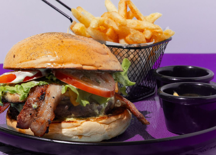 Pan Artesanal 📍Carne Artesanal 📍Queso Mozarrella 📍Tocineta 📍Lechuga 📍Tomate 📍Cebolla 📍Con una porción de papas a la francesa