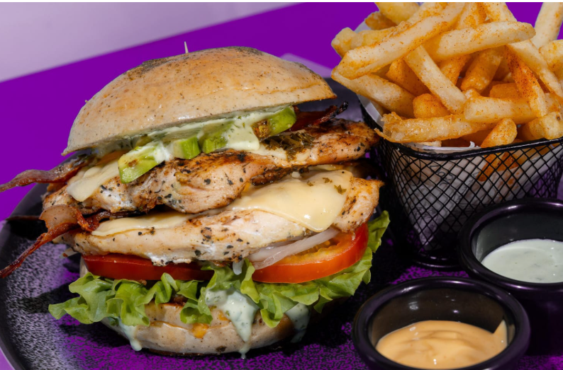 Doble pollo grillé, queso mozzarella, tocineta, lechuga, tomate, chimichurri, cebolla y salsa ahumada.