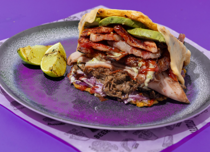 Arepa frita con salsas secretas, ensalada de repollo y zanahoria, carne mechada, jamón, huevo, queso y aguacate.