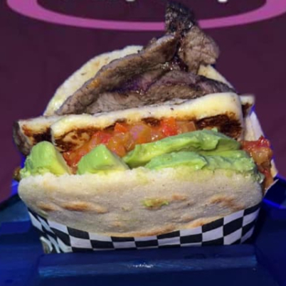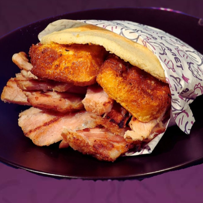 Arepa frita con salsas secretas, ensalada de repollo y zanahoria, chuleta, jamón, huevo, queso y aguacate.