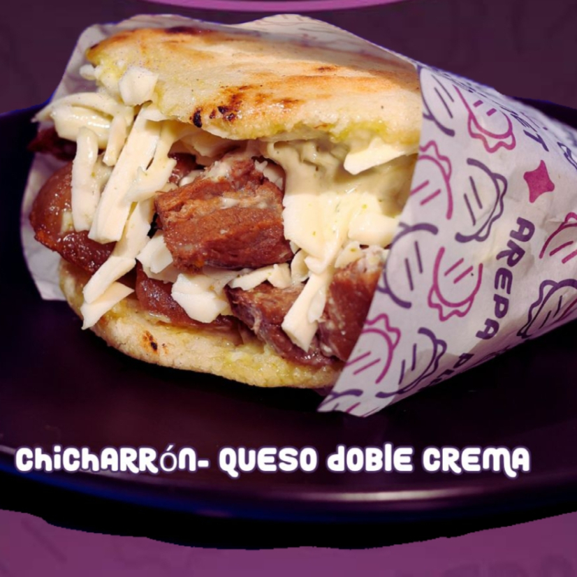 6 Arepitas crujientes con chicharrón, rellenas de queso y nata cremosa.