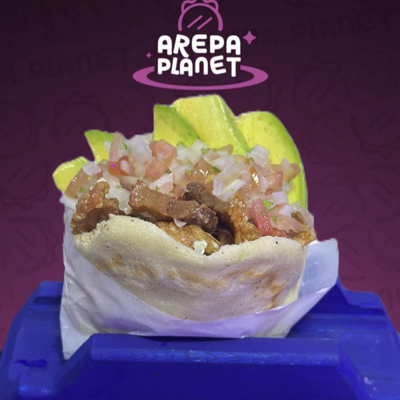Arepa asada con crujiente chicharron, pico de gallo y aguacate