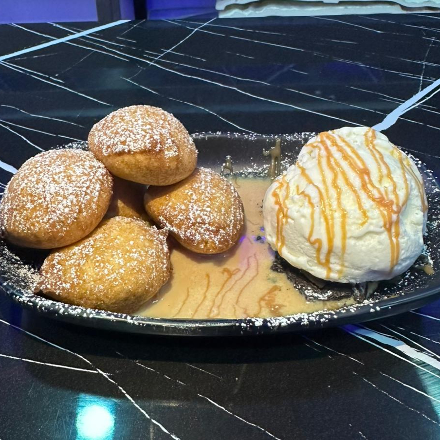 4 Galletas Oreo fritas en masa dulce con azúcar glas y toque cósmico.