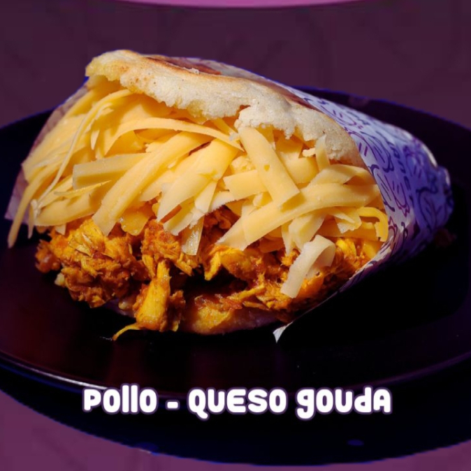 Arepa asada con mantequilla, deliciosa salsa de la casa, pollo mechado acompañado de queso gouda