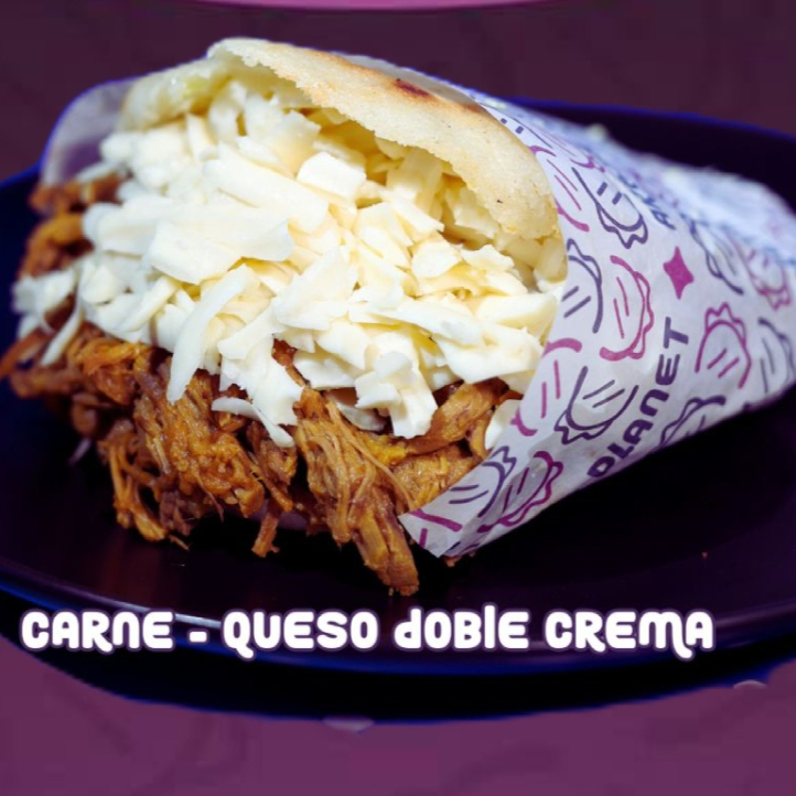 Arepa asada con mantequilla, deliciosa salsa de la casa, carne mechada acompañado de queso doble crema rallado