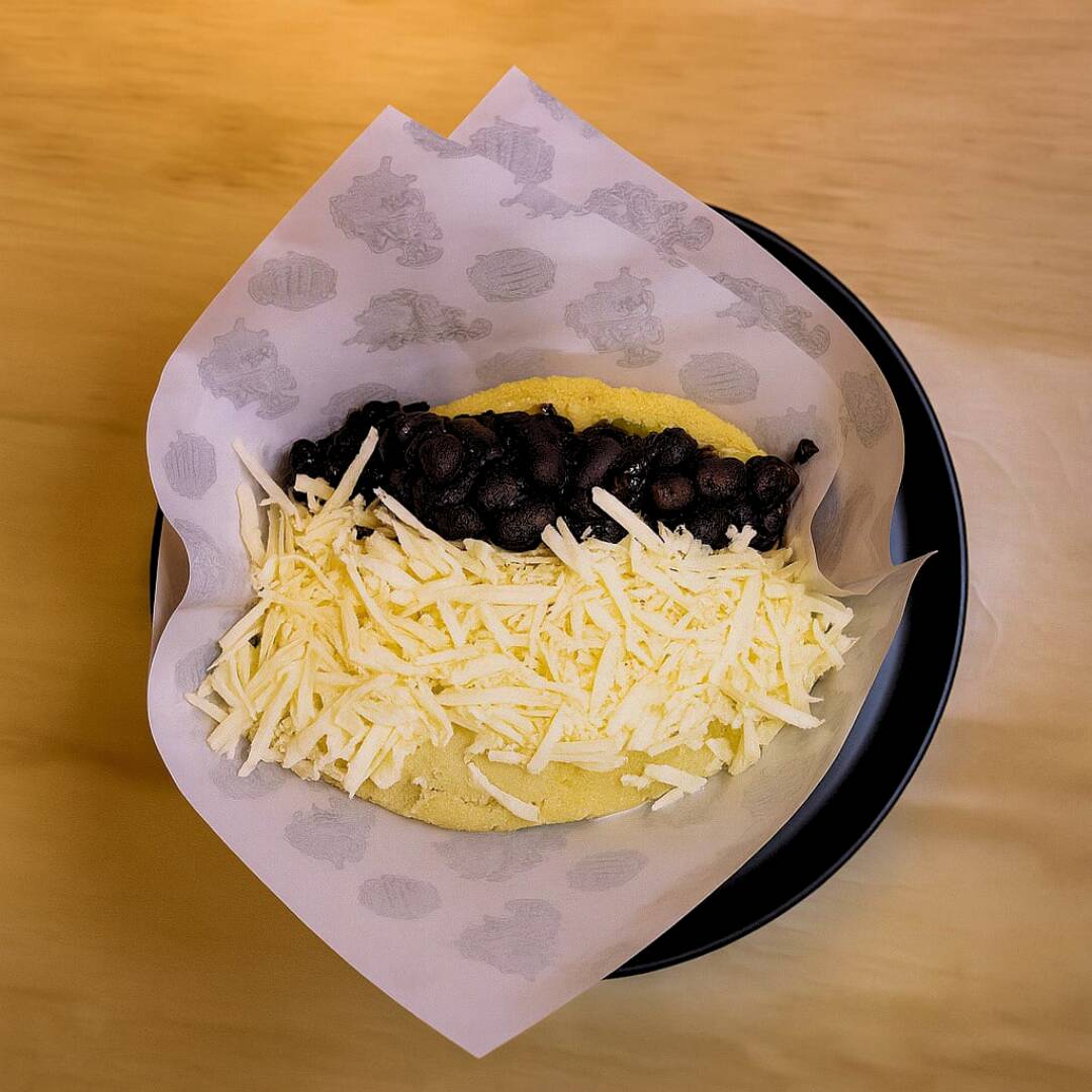 Arepa rellena con queso blanco y caraotas (frijol negro). masa artesanal de maíz y preparación al momento.