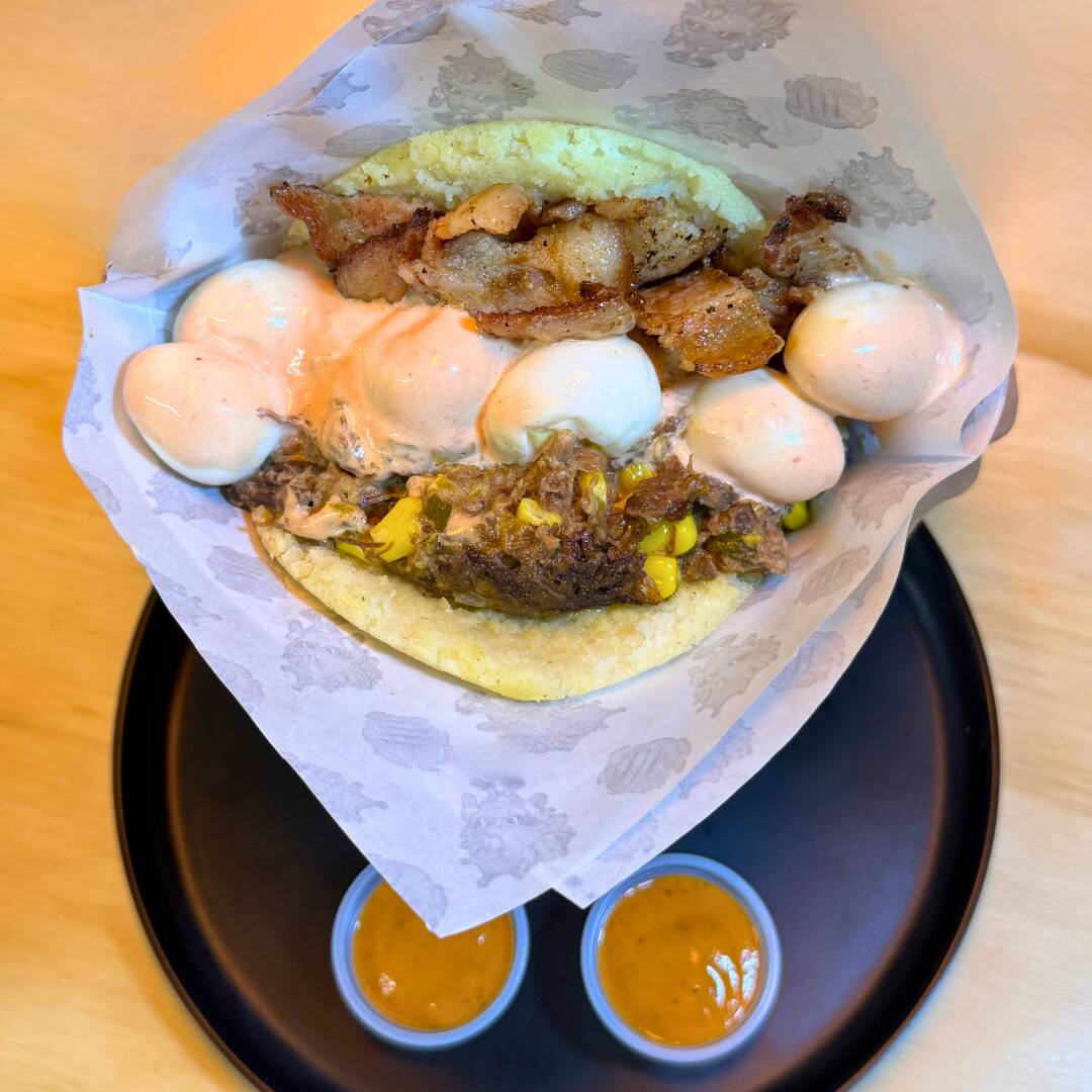 Arepa rellena con carne desmechada, maíz, tocineta, huevo de codorniz acompañada de salsa picante. masa artesanal de maíz y preparación al momento.