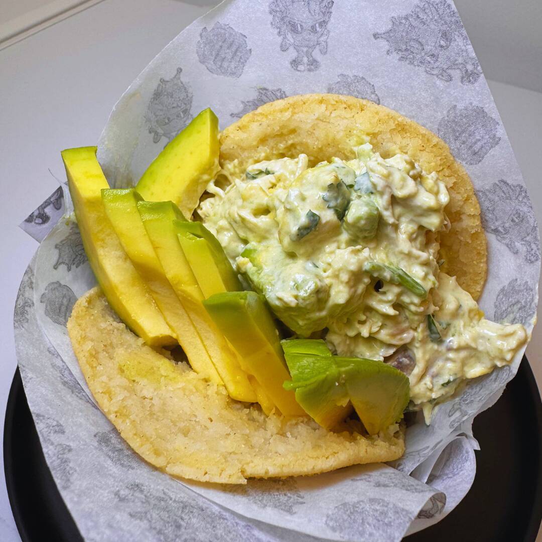 Arepa rellena con pollo desmenuzado, aguacate, salchicha mezclada con mayonesa. masa artesanal de maíz y preparación al momento.