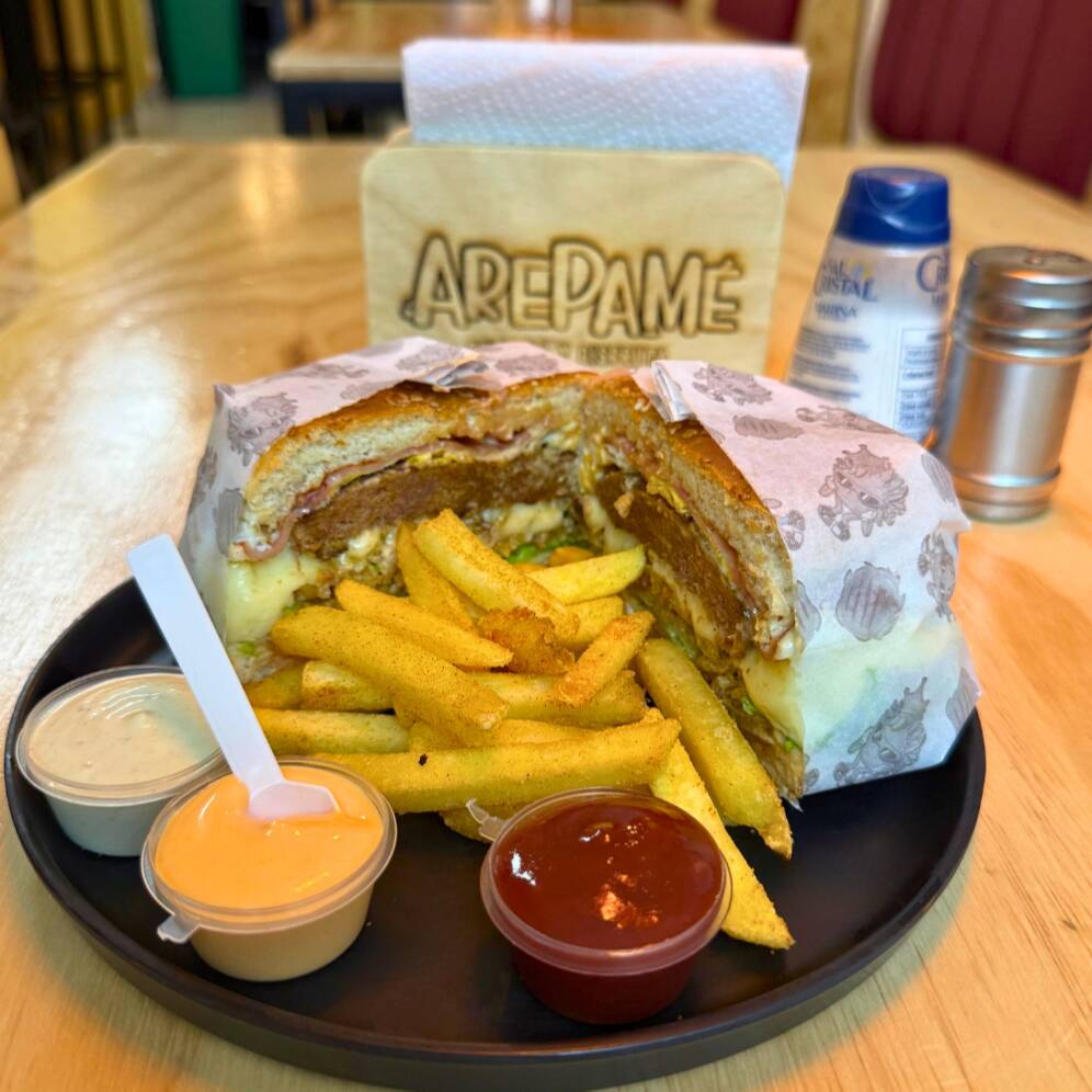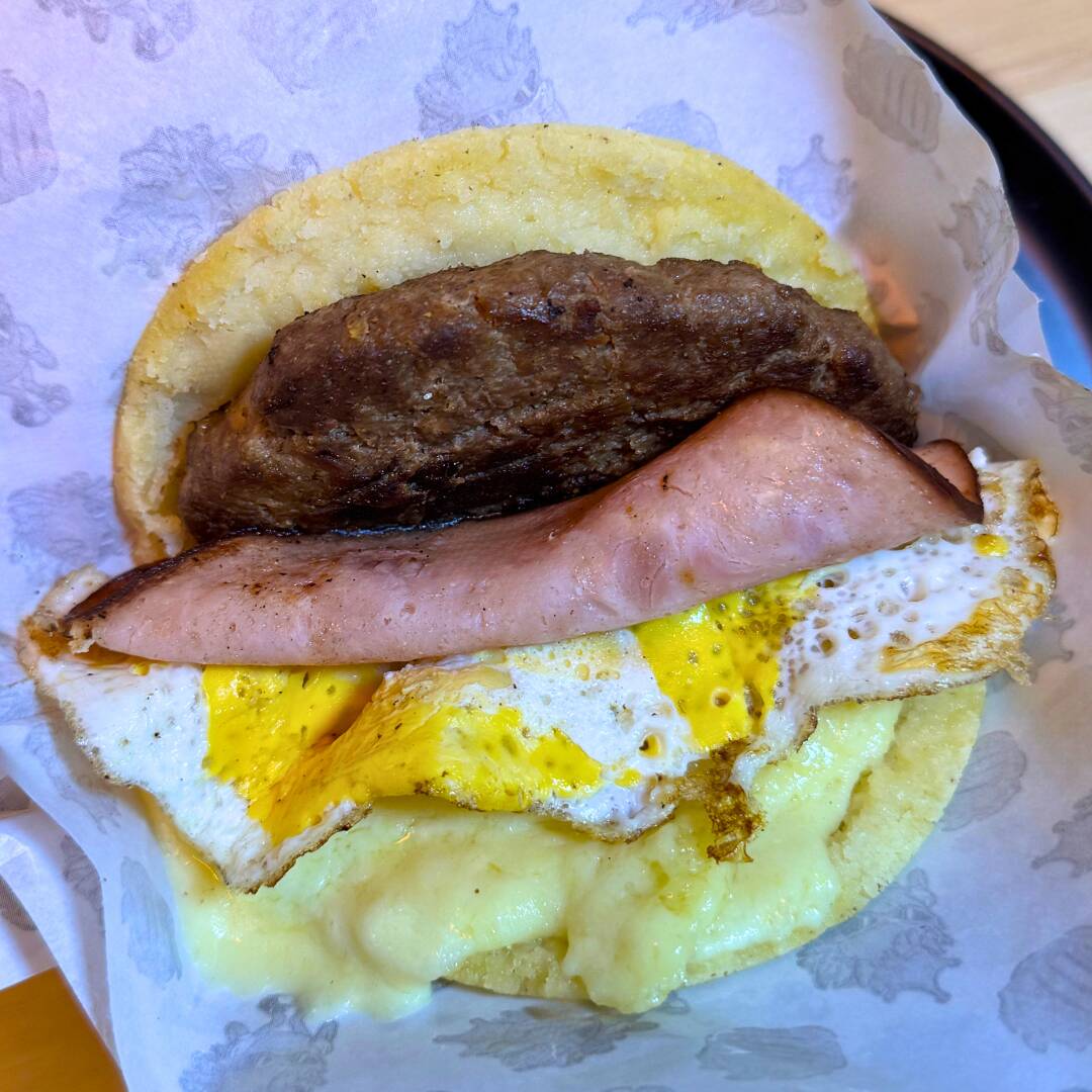 Arepa rellena con carne de hamburguesa, jamón, queso y huevo frito. masa artesanal de maíz y preparación al momento. .