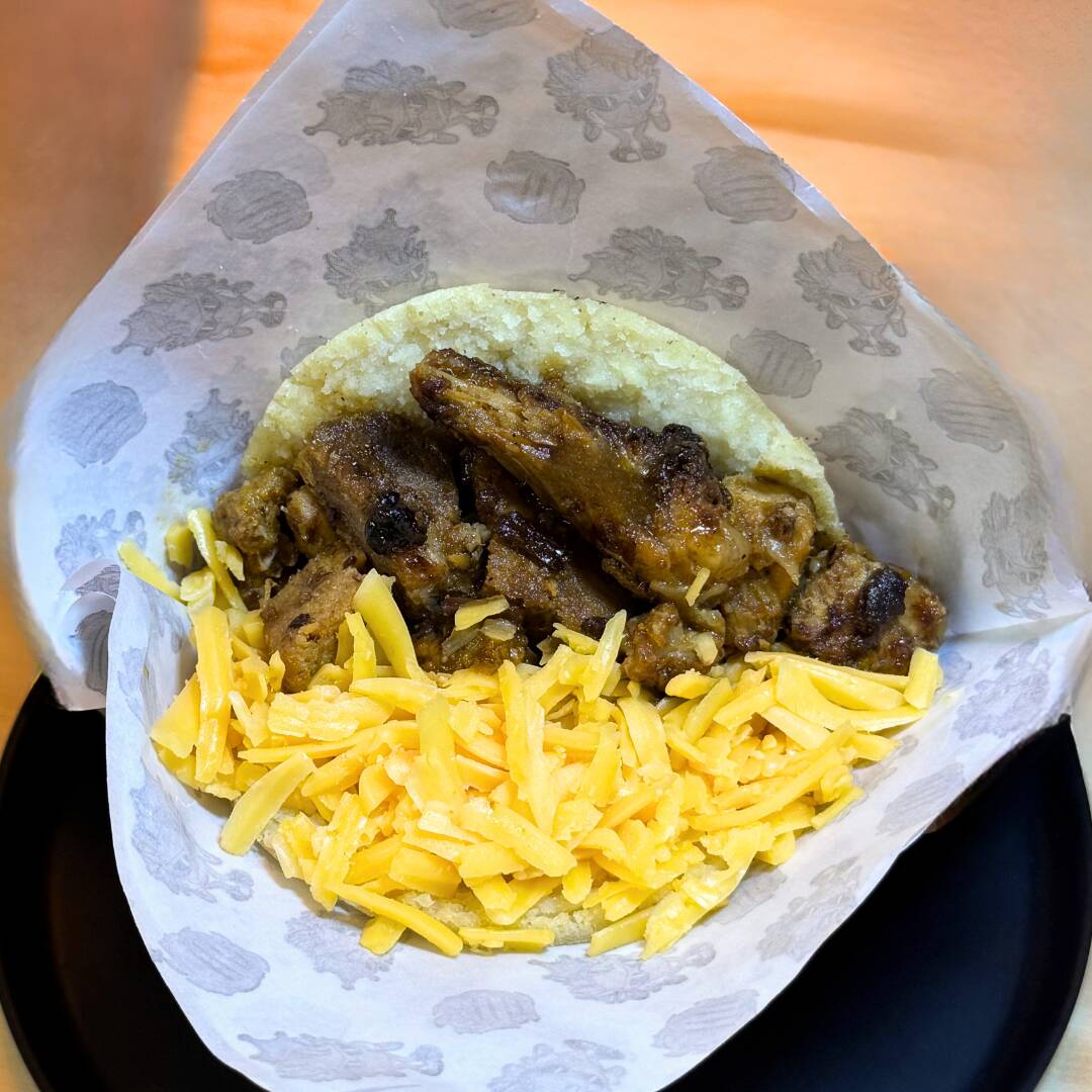 Arepa rellena con carne desmechada y queso amarillo. masa artesanal de maíz y preparación al momento.