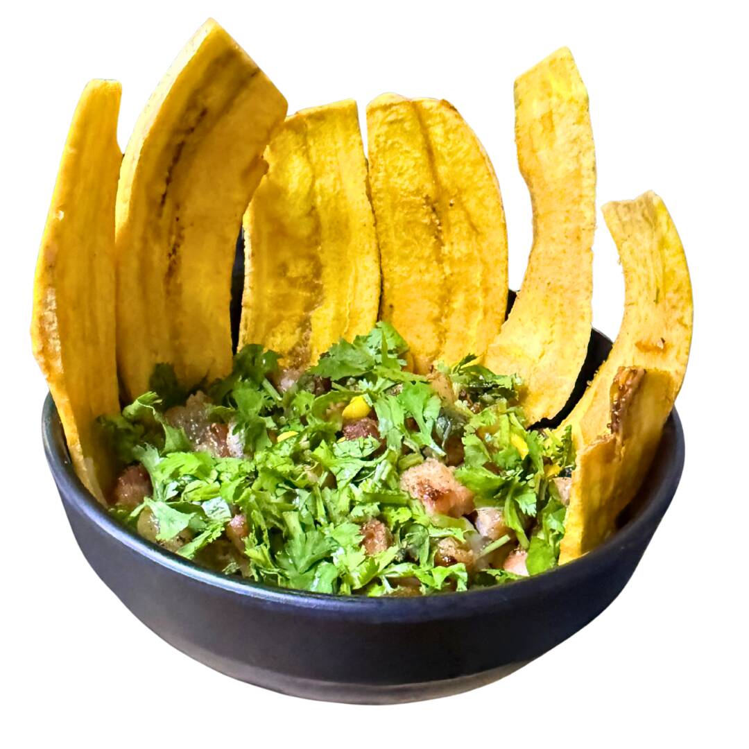 Ceviche de chicharrón acompañado de chips de platano