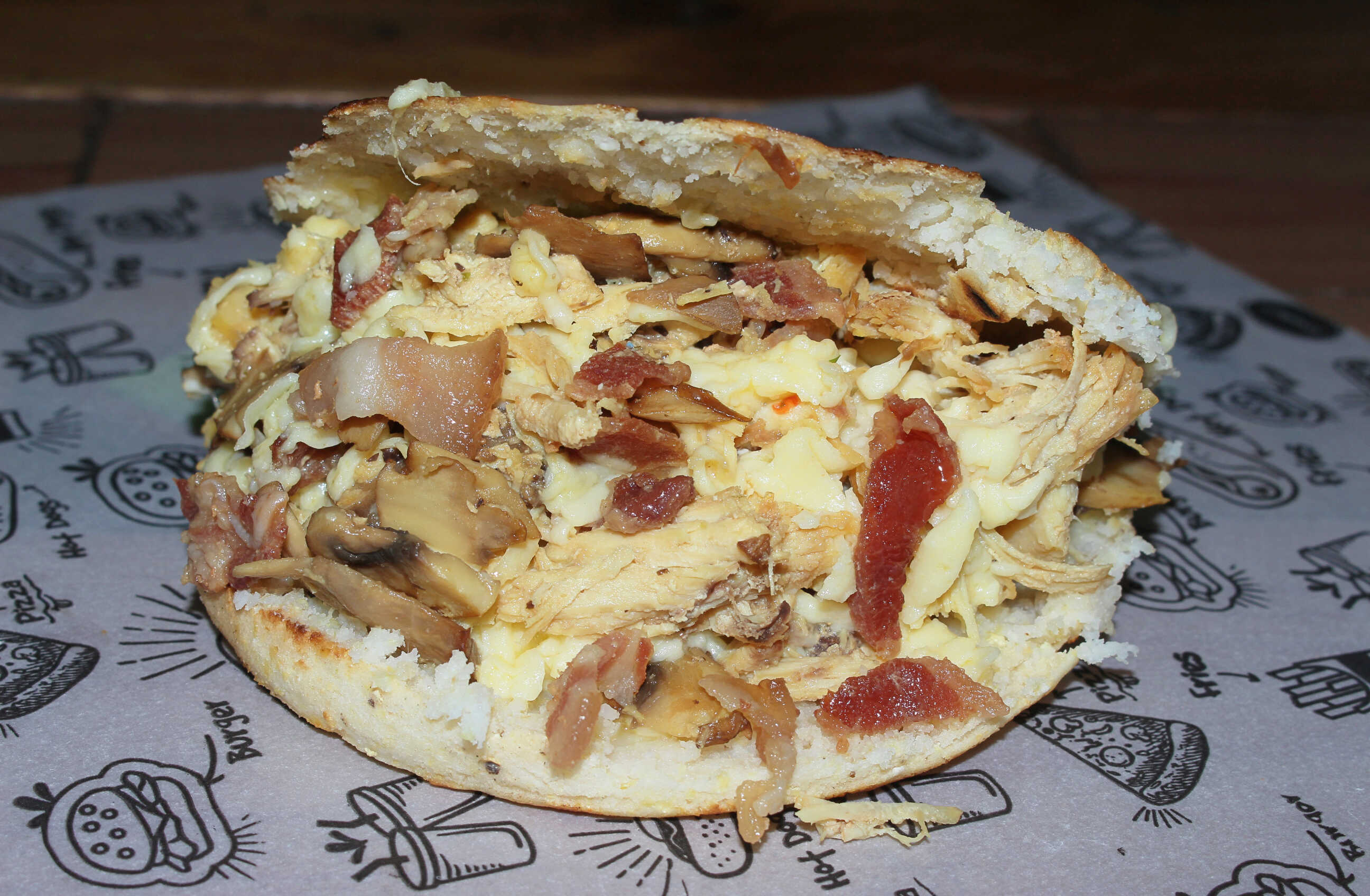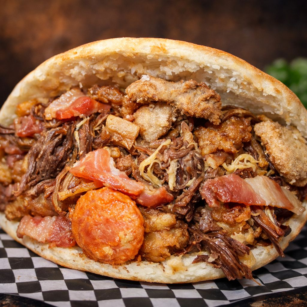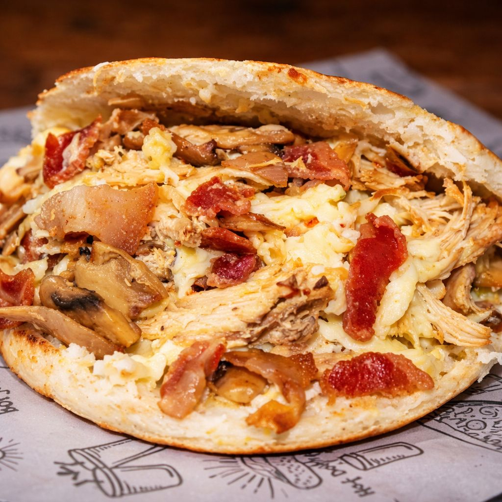 Arepa con pollo carne desmechada, tocineta, chiacharrón, chorizo, y huevo de codorniz.