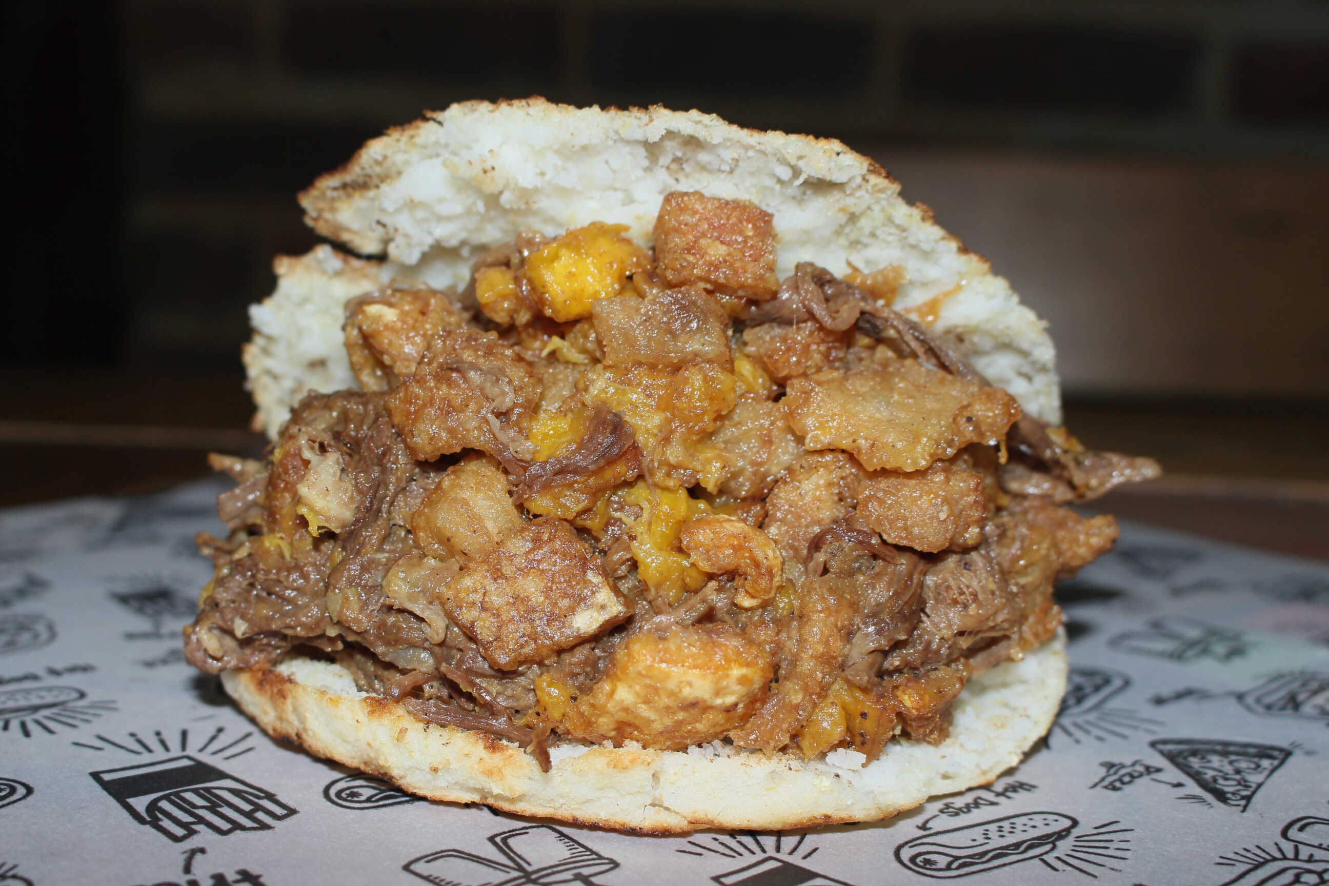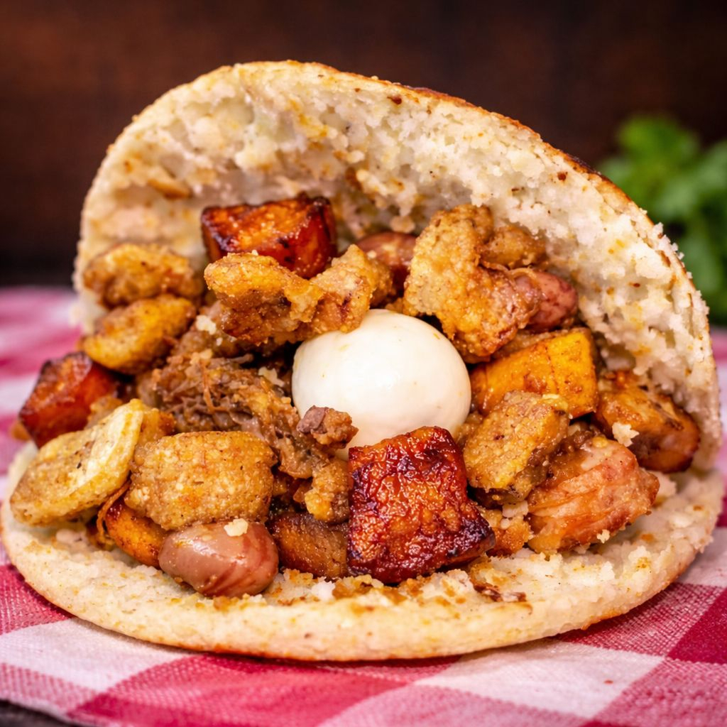 Arepa con chicharrón, carne desmechada, maduritos y huevo de codorniz.