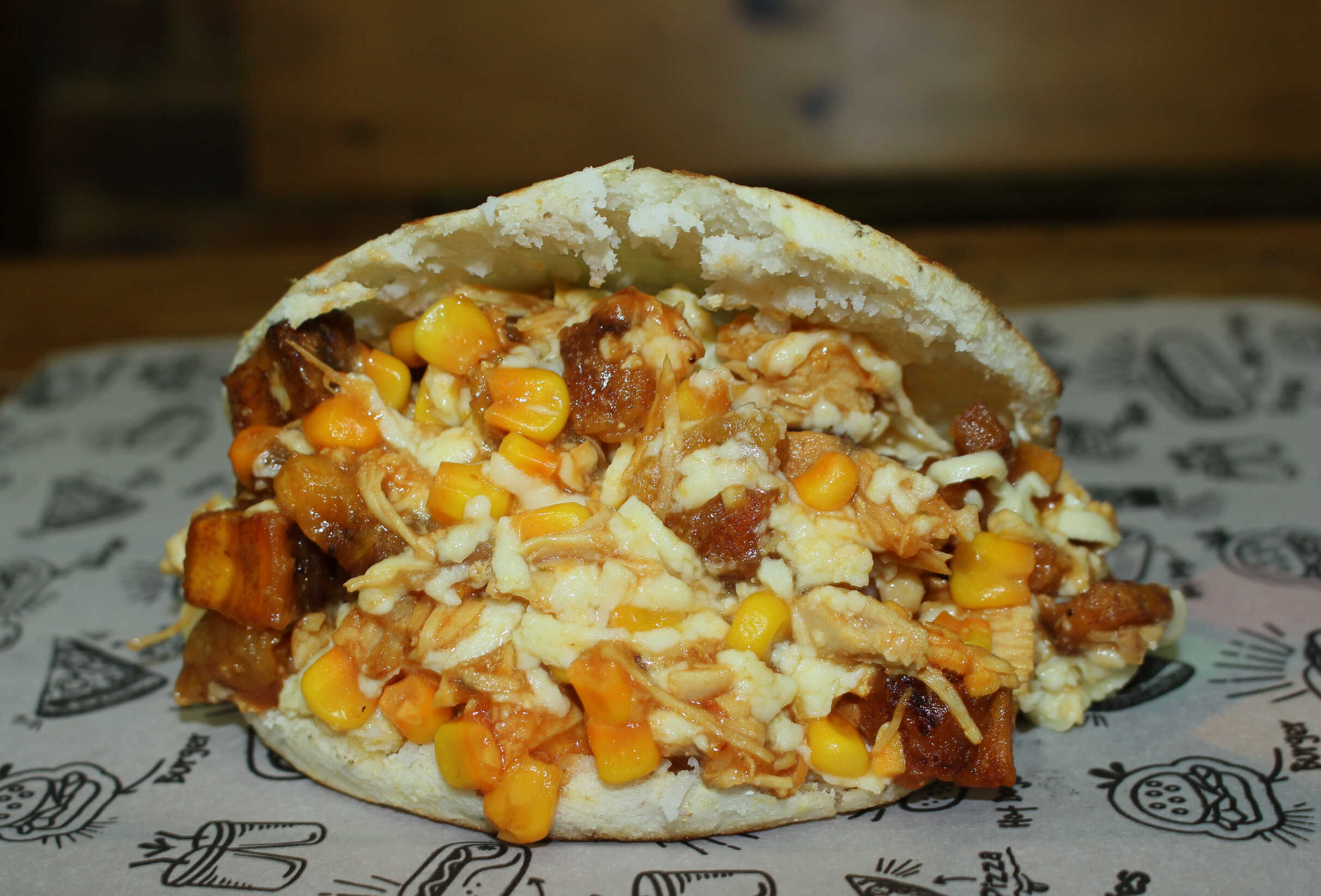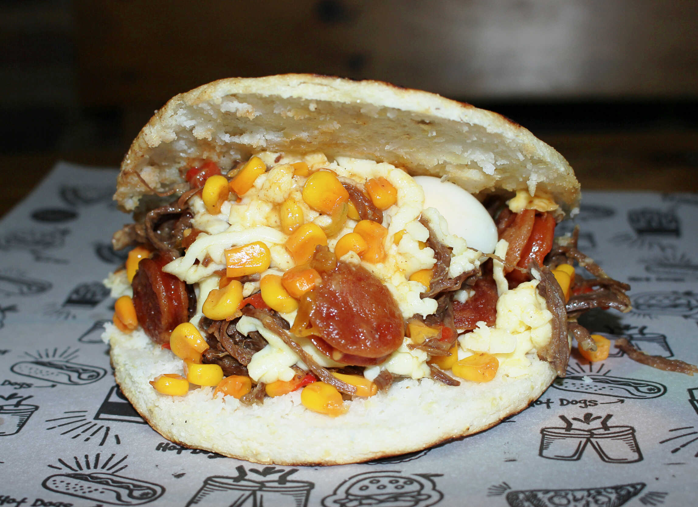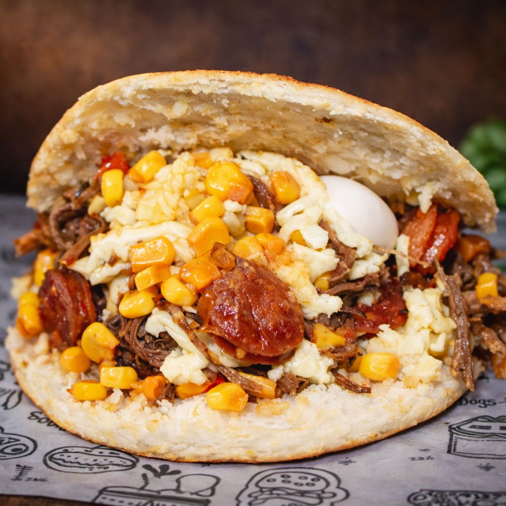 Arepa con carne desmechada, chorizo, maíz tierno, queso mozzarella y huevo de codorniz.
