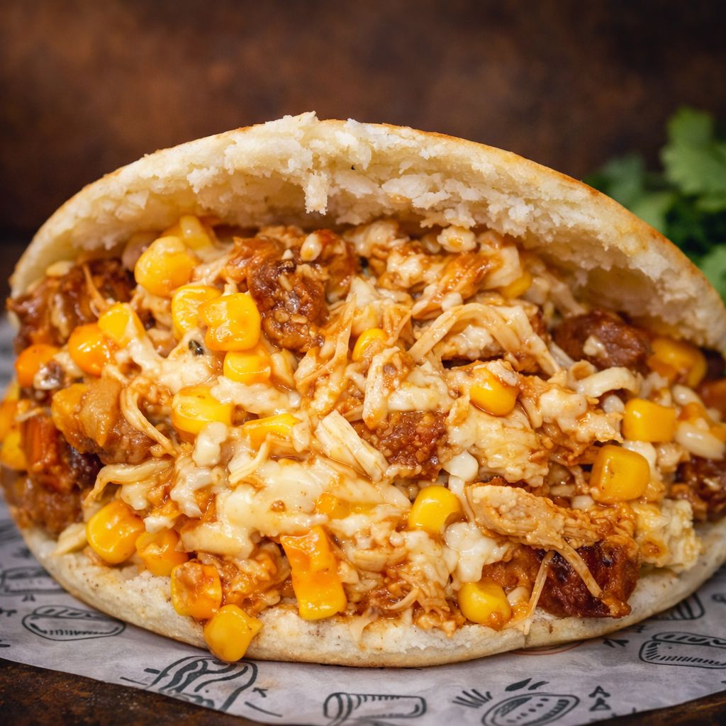 Arepa con pollo, carne desmechada, queso mozzarella y huevo de codorniz.