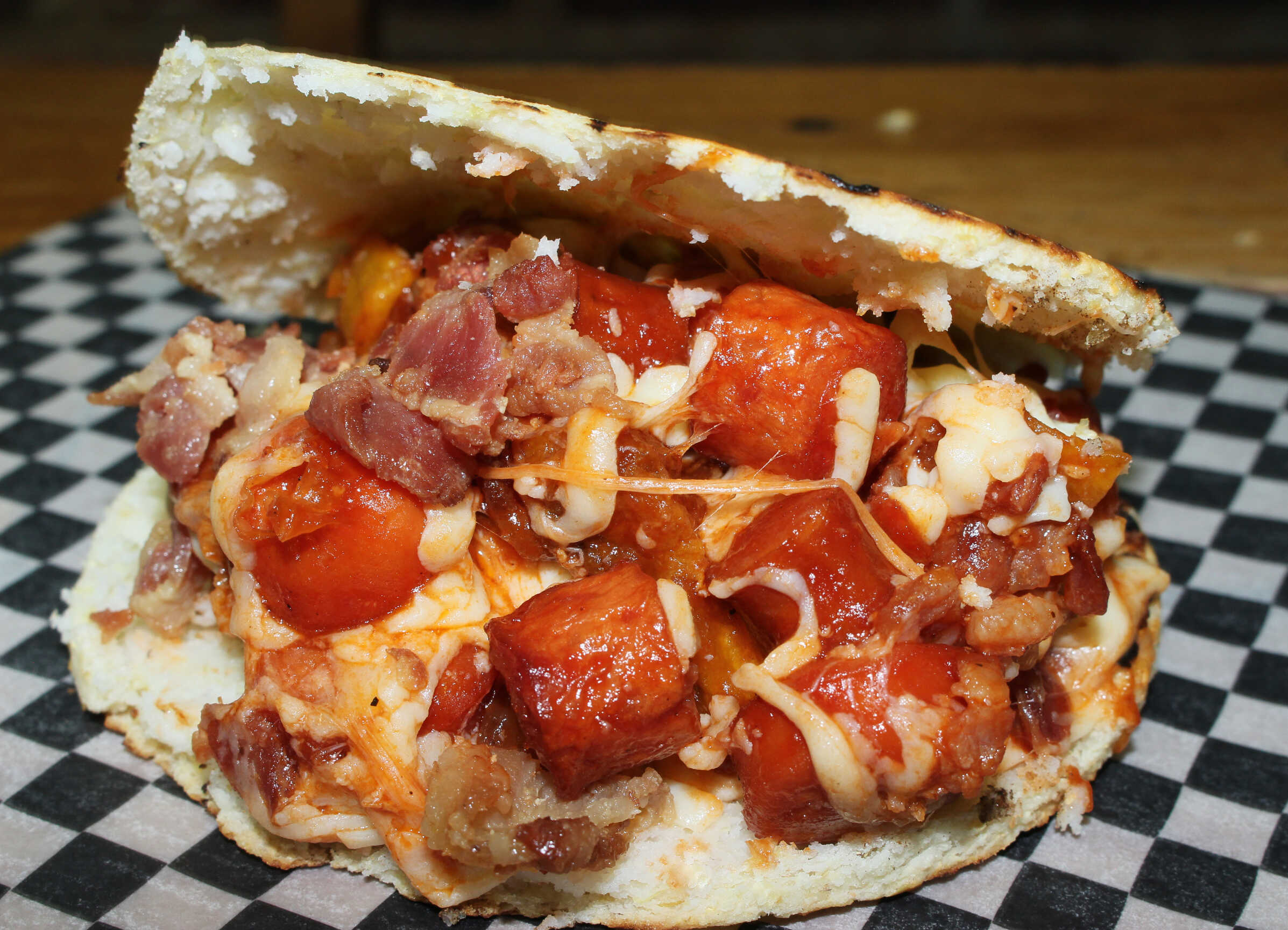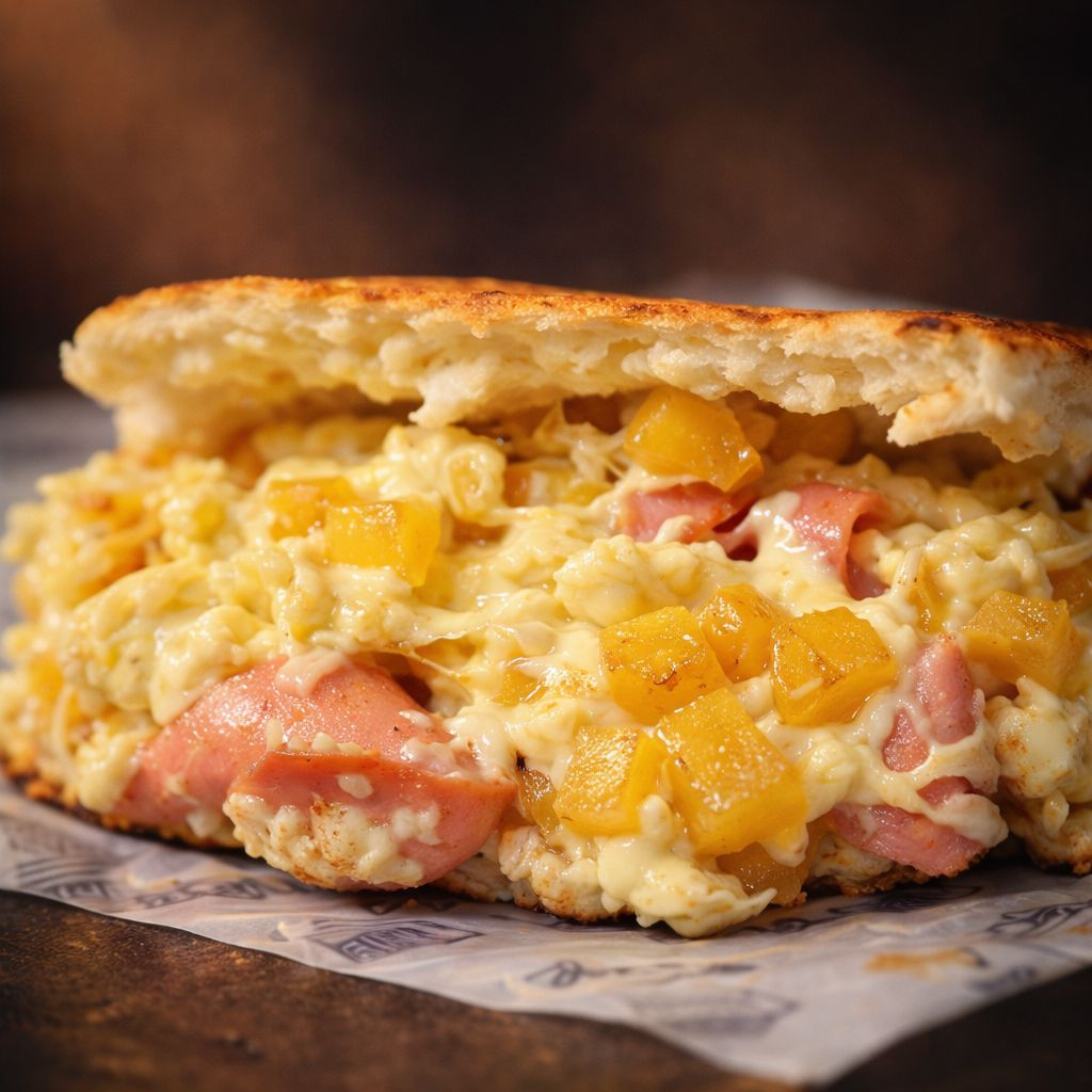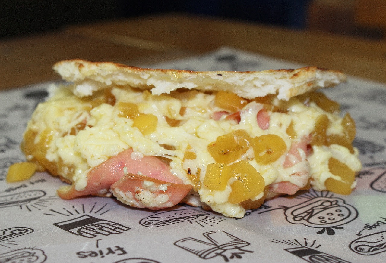 Arepa con jamón, trozos de piña y queso mozzarella.