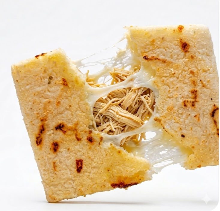 Arepa cuadrada rellena de pollo desmechado y queso mozzarella campesino.