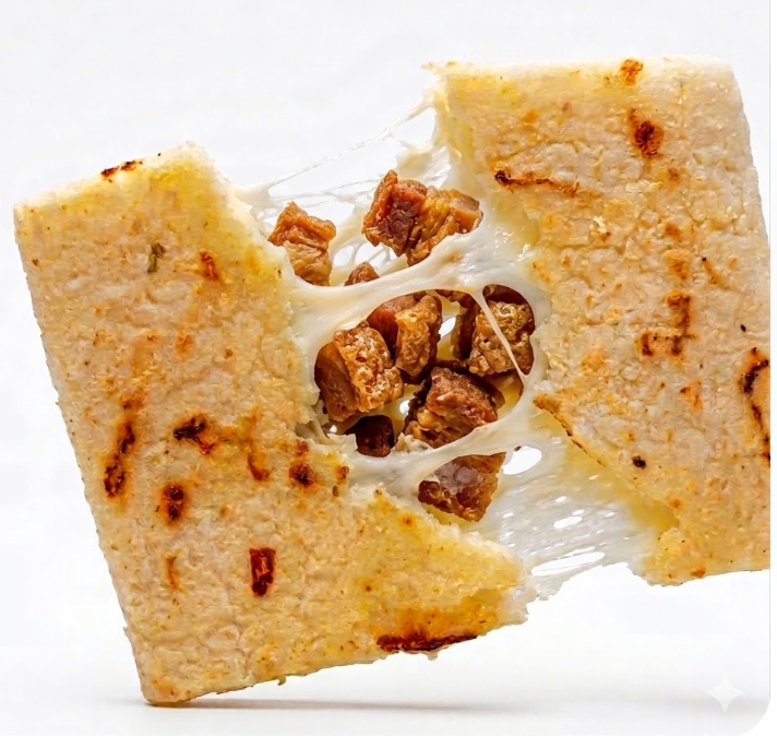 Delicioso chicharrón desgrasado en trozos con queso mozzarella campesino.