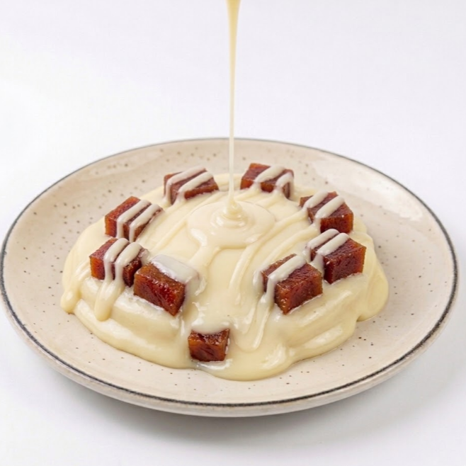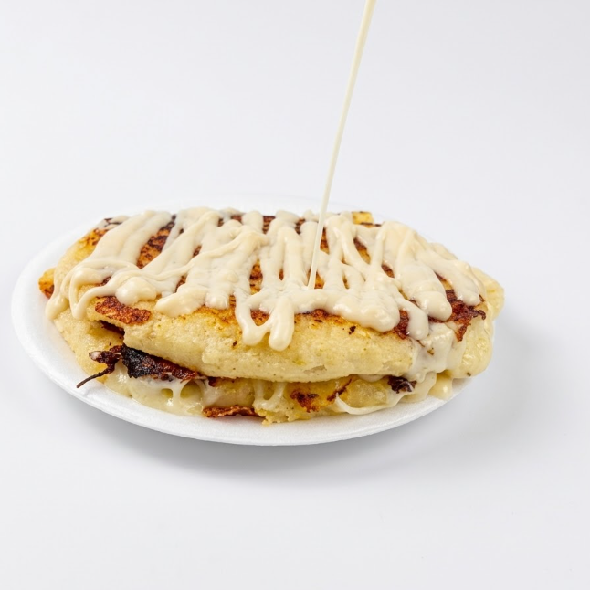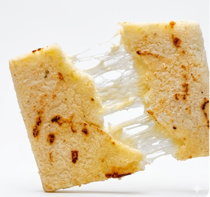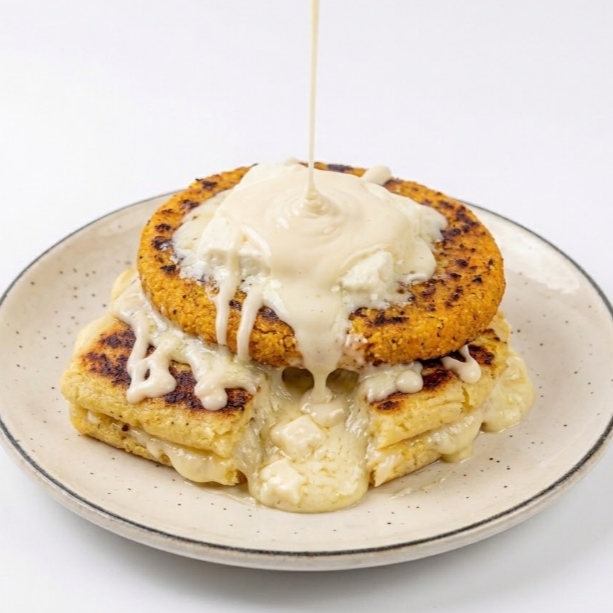 Arepa Quesuda con Lecherita y Queso Rallado.