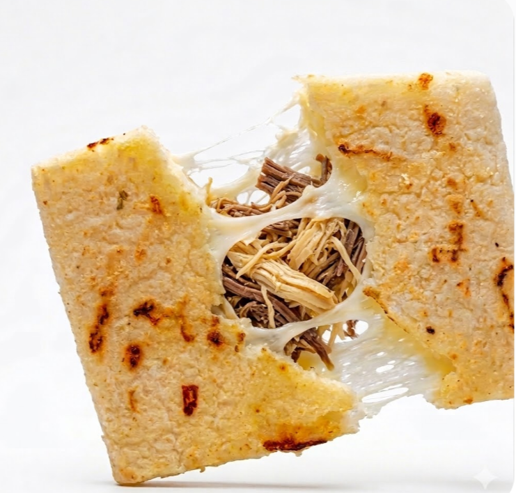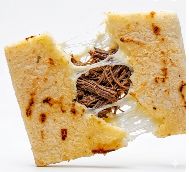 Arepa cuadrada rellena de carne de res desmechada y queso mozzarella campesino.