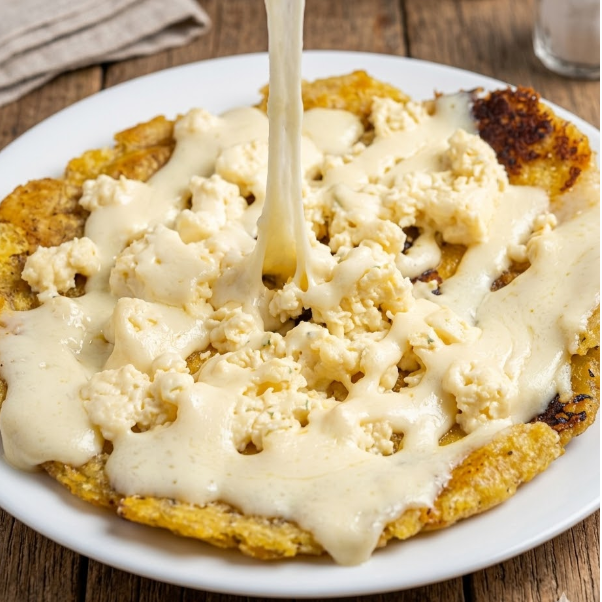 Para los amantes del queso, doble arepa quesuda bañada en lecherita.
