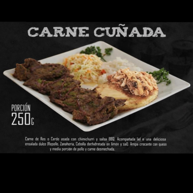Carne de res cuñada 250 g de carne de res asada con chimichurri y salsa BBQ, acompañada de una deliciosa ensalada dulce (repollo, zanahoria, cebolla deshidratada con limón y sal), arepa crocante con queso y media porción de pollo desmechado y carne desmechada.