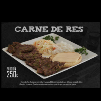 250 g De Carne de res asada con chimichurri y salsa BBQ, acompañada de una deliciosa ensalada dulce (repollo, zanahoria, cebolla deshidratada con limón y sal) y arepa crocante con queso.
