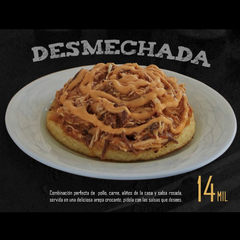 Combinación perfecta de pollo y carne desmechada, aliños de la casa y salsa rosada, servida en una deliciosa arepa crocante.
