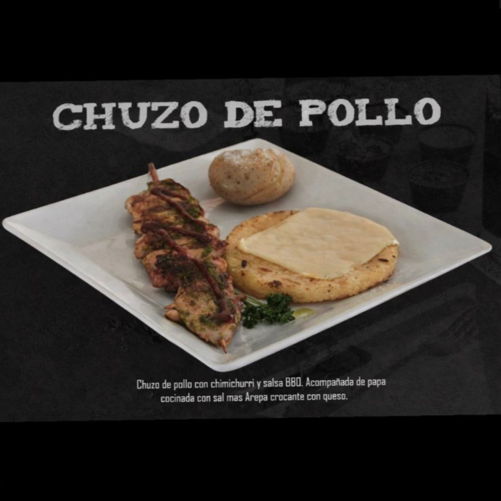 1 Chuzo de pollo asado con chimichurri y salsa BBQ, acompañado de 1 papa cocinada con sal y arepa crocante con queso y media porción de pollo desmechado y carne desmechada.