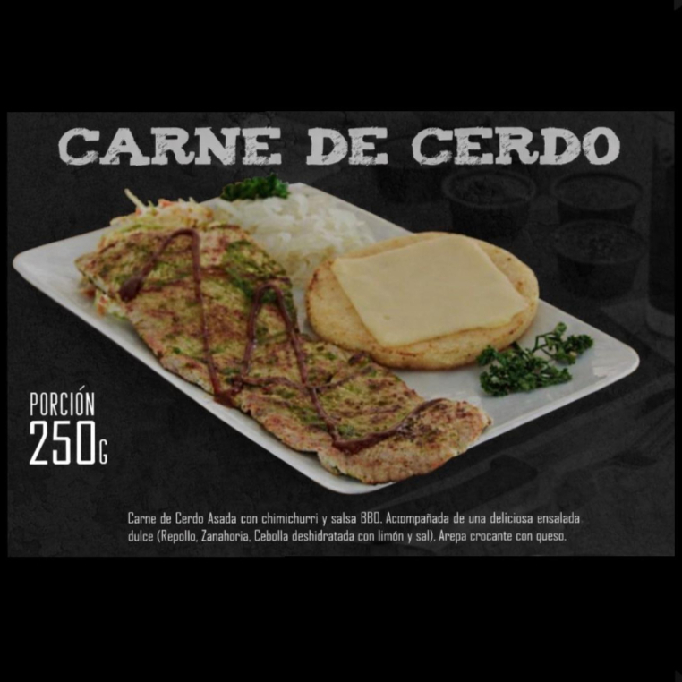 250 g De carne de cerdo asada con chimichurri y salsa BBQ, acompañada de una deliciosa ensalada dulce (repollo, zanahoria, cebolla deshidratada con limón y sal) y arepa crocante con queso.