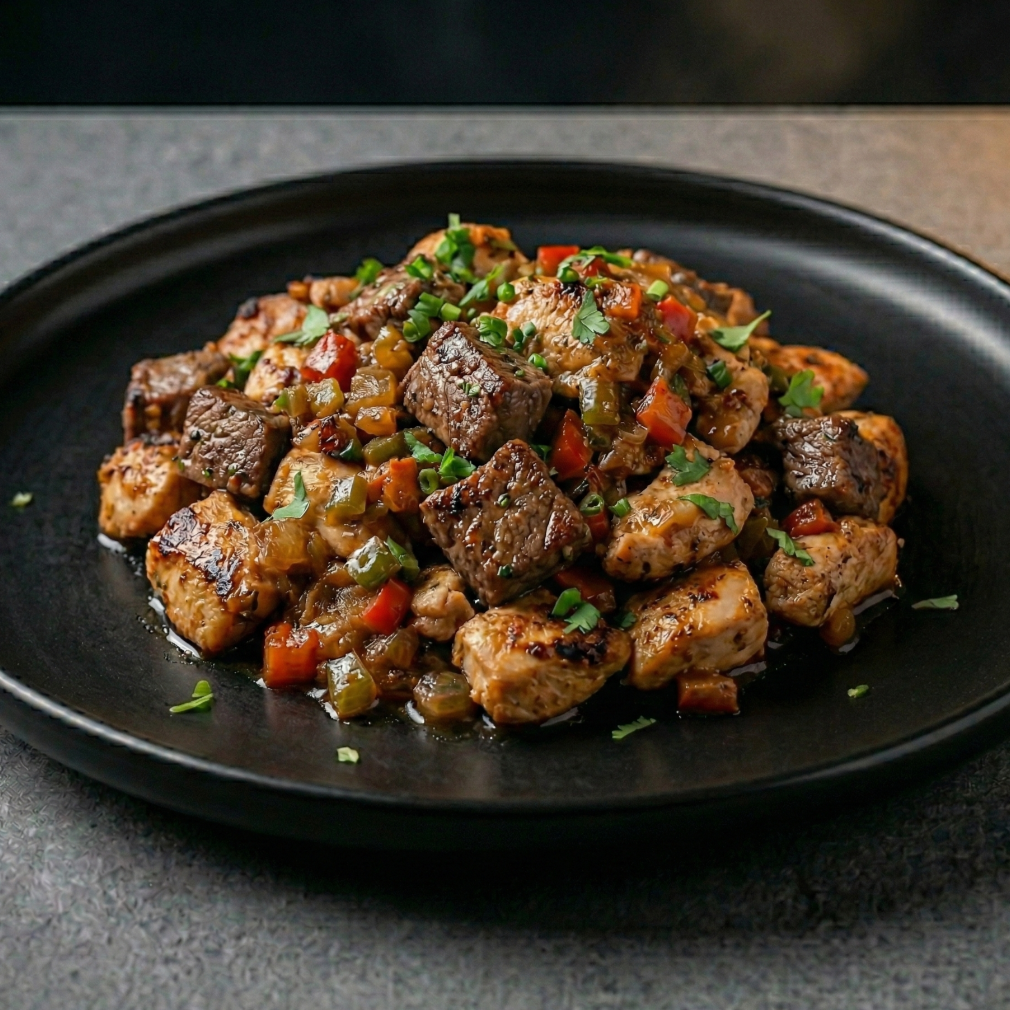 Queso mozzarella, hogao, guacamole, tocineta, carne y pollo, chicharrón, BBQ, (180 g de proteína).