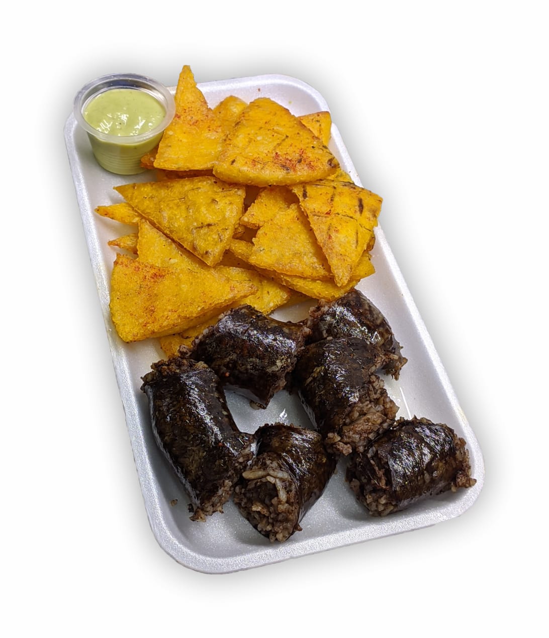 NACHOS DE MOTE FRITO, ACOMPAÑADOS DE POLLO Y CARNE DE RES DESMECHADA Y QUESO DERRETIDO, SOUR CREAM, Y GUACAMOLE CASERO